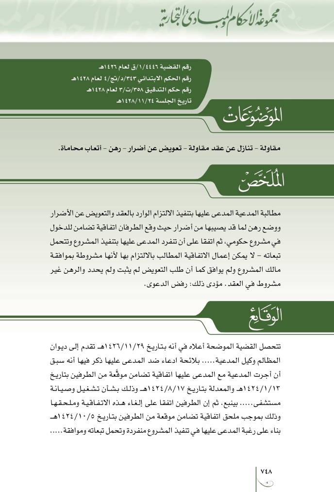 مقاولة ، تنازل عن عقد مقاولة ، تعويض عن أضرار