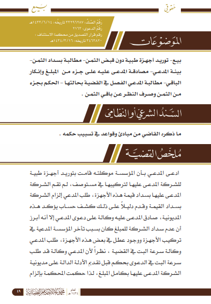 توريد أجهزة طبيه دون قبض الثمن