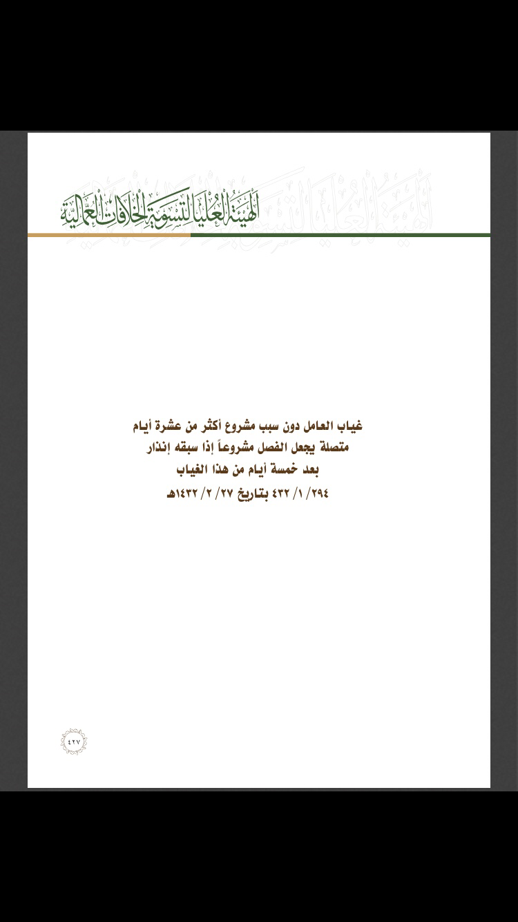غياب العامل دون سبب مشروع أكثر من عشرة ايام متصله يجعل الفصل مشروعاً اذا سبقه إنذار بعد خمسة أيام من هذا الغياب
