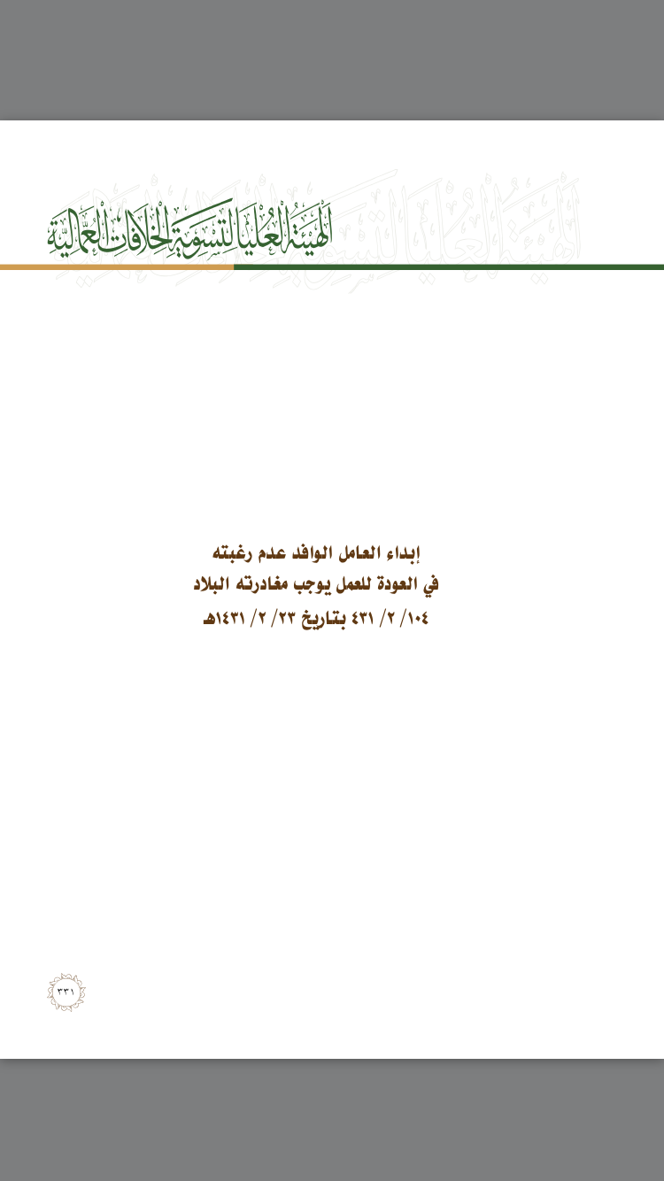 إبداء العامل الوافد عدم رغبته في العودة للعمل يوجب مغادرته للبلاد.