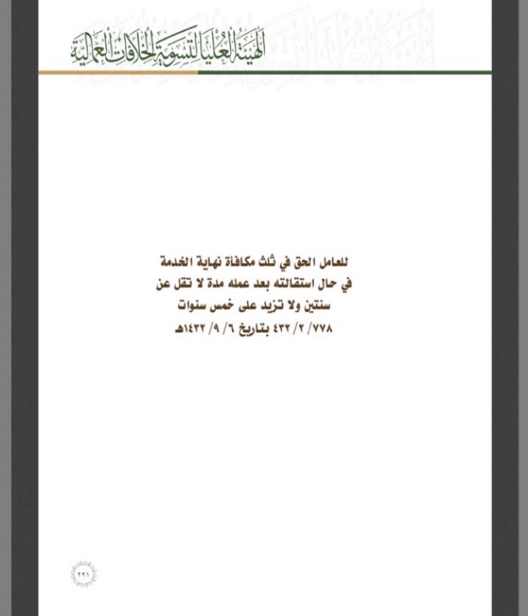 للعامل الحق في ثلث مكافأة نهاية الخدمة في حال استقالته بعد عمله مدة لاتقل عن سنتين ولا تزيد على خمس سنوات