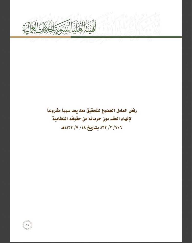 رفض العامل الخضوع للتحقيق معه يعد سبباً مشروعاً لانهاء العقد دون حرمانه من حقوقه النظاميه